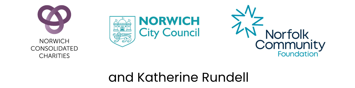 The image shows the logos of Norwich Consolidated Charities, Norwich City Council, Norfolk Community Foundation and Katherine Rundell.